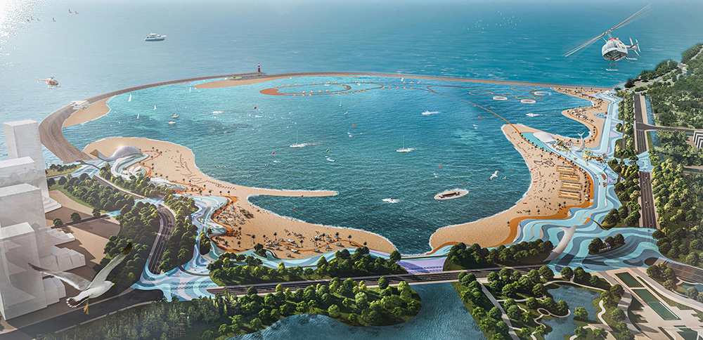 該項(xiàng)目位于月亮灣旅游度假區(qū)海堤外側(cè),以海濱文體旅游綜合體為定位,以2012年四條鯨魚(yú)擱淺新灘鹽場(chǎng)附近事件為引,結(jié)合古黃河文化和海洋文化,構(gòu)建以“鯨魚(yú)沙灘”為主題的IP。浴場(chǎng)主要功能為旅游、娛樂(lè)、度假、海洋科普教育、康體運(yùn)動(dòng)、專(zhuān)業(yè)賽事、遠(yuǎn)洋觀(guān)光、節(jié)慶活動(dòng)等,按照分區(qū)設(shè)計(jì),項(xiàng)目整體設(shè)計(jì)分為四大主題和特色體驗(yàn)區(qū),四大主題分別為“鯨舞”“鯨憩”“鯨游”“鯨躍”等主題板塊,十二個(gè)特色體驗(yàn)區(qū)為抹香鯨主題中心、商業(yè)美食街區(qū)、露營(yíng)基地、水上運(yùn)動(dòng)區(qū)、沙灘體育基地、主題水上樂(lè)園、海上舞臺(tái)、海上度假區(qū)、帆船中心、遠(yuǎn)洋觀(guān)光區(qū)、浪漫藝術(shù)海岸、漂浮體驗(yàn)區(qū)。